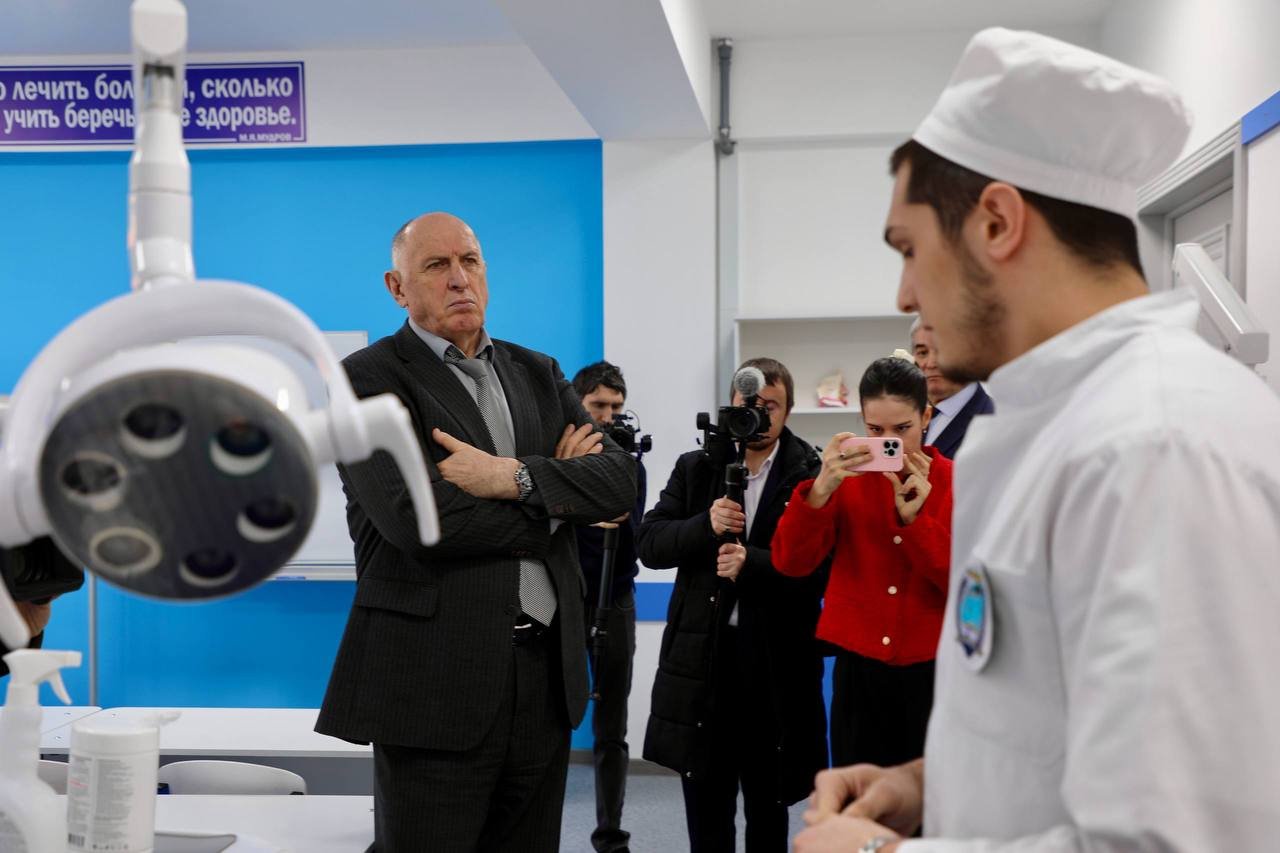 Во вторник, 10 марта, Председатель Правительства Республики Дагестан Абдулмуслим Абдулмуслимов принял участие в официальной презентации АНО высшего образования «Северо-Кавказский университет дружбы народов», расположенном в г. Махачкале. Перед началом торжественного мероприятия премьер-министр ознакомился с организацией образовательного процесса и текущими достижениями учебного заведения, а также примыкающего к вузу Северо-Кавказского гуманитарно-многопрофильного колледжа имени Имама Шамиля. Особое внимание было уделено внедрению современных образовательных технологий и программ, направленных на подготовку специалистов, востребованных на рынке труда. Экскурсию по вузу для премьер-министра провел ректор учреждения Тавлу Казакбиев. В состав вуза входит 5 факультетов, 5 кафедр и Международный институт Интегративной медицины. Университет ведет прием студентов уже второй учебной год и предлагает программы высшего образования по таким направлениям, как стоматология, фармация, клиническая психология и психология, а также среднего профессионального образования. Сегодня на двух факультетах здесь обучается 136 студентов очной формы. Абдулмуслим Абдулмуслимов ознакомился с новыми образовательными программами и студенческой жизнью университета, прошелся по учебным лабораториям и научным центрам, где оценил современную материально-техническую базу и условия для обучения студентов. ВУЗ уделяет большое внимание патриотическому воспитанию. В кабинетах, по которым прошелся премьер Дагестана, расположились информационные уголки и мемориальные стенды поэту Расулу Гамзатову, бывшему председателю Госсовета Магомедали Магомедову, первому Герою России Нурмагомеду Гаджимагомедову, олимпийскому чемпиону по боксу Альберту Батыргазиеву. Кроме того, на базе вуза функционируют фармацевтические и химические лаборатории, симуляционный, анатомический и гистологический кабинеты, кабинет информационных технологий. Заключены договоры с более чем 20 больницами и клиниками г.Махачкалы и г.Каспийска, что позволяет студентам проходить практические занятия в ведущих государственных и частных клиниках. Особое внимание премьер уделил стоматологическому кабинету, оборудованному для практического обучения студентов, где лично оценил практические возможности обучения будущих стоматологов. Каждый студент имеет возможность здесь оттачивать свои навыки, используя созданный манекен и необходимые стоматологические инструменты. Абдулмуслим Абдулмуслимов высоко оценил современные условия, созданные для обучения будущих специалистов, отметив важность практического опыта для студентов. «Такие кабинеты являются ключевыми для подготовки квалифицированных кадров, которые смогут обеспечить высокий уровень медицинских услуг в нашей республике», - подчеркнул он. Премьер также признался, что в последнее время часто посещает кабинет стоматолога, и потому это медицинское направление ему особо интересно. В ходе обхода по кабинетам вуза председателю правительства презентовали современный цифровой аналог анатомического интерактивного стола Пирогова. «Пирогов» является не просто 3D атласом анатомии, а комплексом из множества детально проработанных структур нормального и патологического строения с встроенными программами по след
